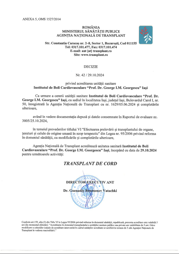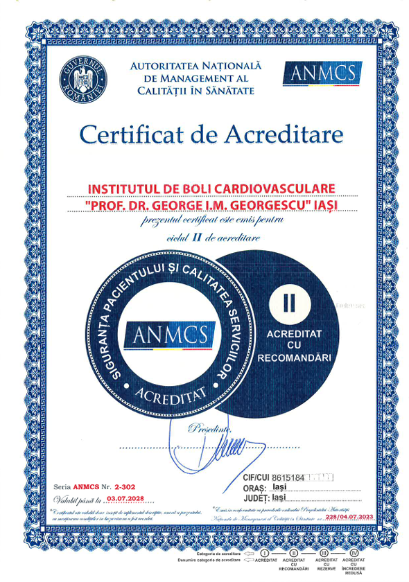 Institutul de Boli Cardiovasculare Iași este acreditat conform legislației în vigoare, ca unitate sanitară care îndeplinește standardele naționale de calitate și siguranță a actului medical. Acreditarea reflectă angajamentul constant al institutului pentru furnizarea de servicii medicale performante, centrate pe pacient, în condiții de maximă siguranță și profesionalism.